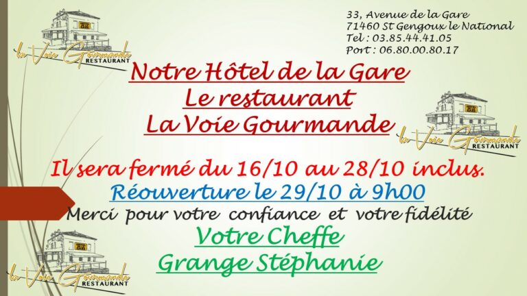 Stéphanie et Gérard vous accueillent dans leur établissement qui se situe en Bourgogne du Sud, sur la route des vins, dans la belle cité médiévale de Saint-Gengoux-le-National. L’hôtel de la Gare et son restaurant « La Voie Gourmande » se trouve à proximité de la Voie Verte en bas de l’Avenue de la Gare.